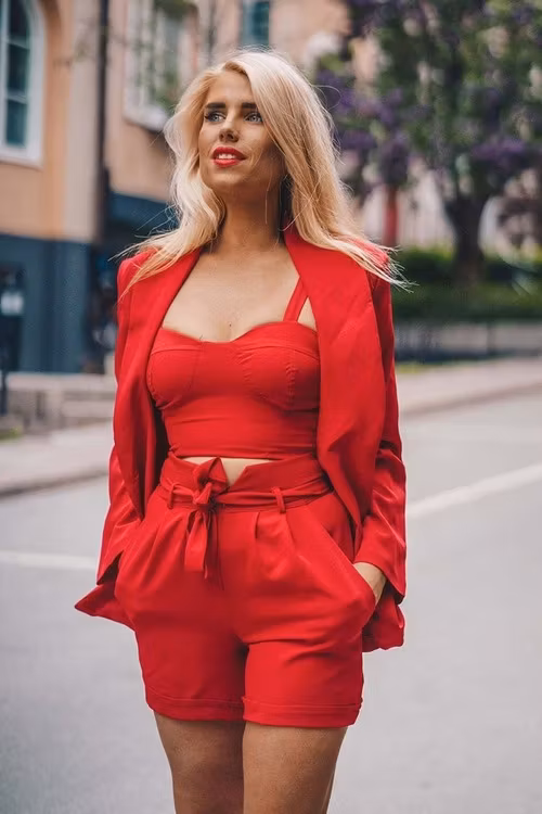 Ett sett i 3 delar.Shorts med knappar, midjeband och fickor framtill.Topp med justerbara axelband, knappar och dragkedja i ryggen.Kavaj med en knapp framtill.De